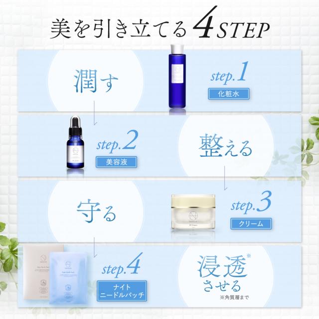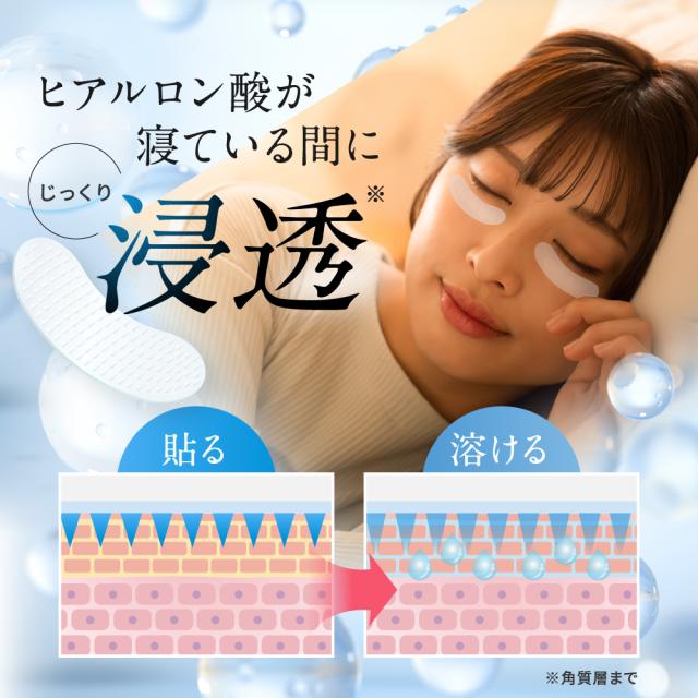 約1500本(1回分)のマイクロニードルが気になる部分にフィットし、乾燥しやすい目元・口元の角質層にうるおい成分を届けます。パッチを貼って寝るだけの簡単ケア。ヒアルロン酸*1やヒト幹細胞培養液*2を含んだニードルがゆっくり溶け出し、角質層まで浸透します。5時間以上貼っていただく事をおすすめしています。*1ヒアルロン酸Na *2ヒト幹細胞順化培養液 プレミアムナイトケアとして、週に1〜2回ご使用ください。