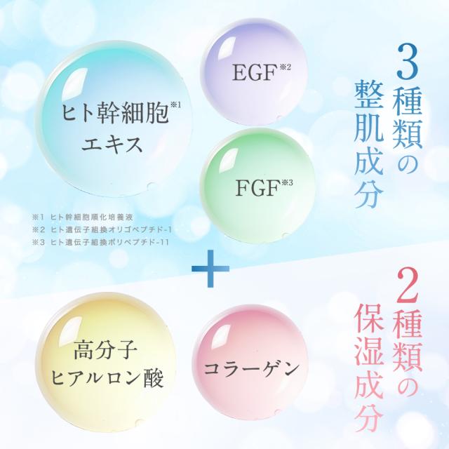 【全成分表示】ヒアルロン酸Na、ヒト脂肪由来間葉系細胞エクソソーム、ヒト幹細胞順化培養液、グルタチオン、ナイアシンアミド、プラセンタエキス、加水分解コラーゲン、3-O-エチルアスコルビン酸、パルミチン酸アスコルビルリン酸3Na、ヒト遺伝子組換オリゴペプチド-1、セラミドNG、セラミドNP、セラミドAP、ヒト遺伝子組換ポリペプチド-11、1,2-ヘキサンジオール、マンニトール、PG、クオタニウム-33、コレステロール、BG、キサンタンガム、ジステアリルジモニウムクロリド、水添レシチン、ココイルサルコシンNa、フェノキシエタノール