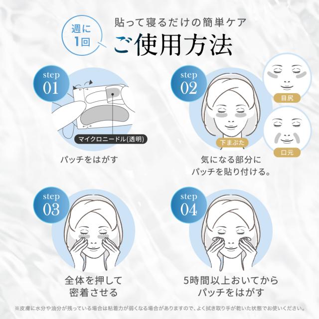 寝ている間に簡単ナイトケア! ?パッチをはがす。?気になる部分にパッチを貼り付ける。?全体を押して密着させる。5時間以上おいてからパッチをはがす。