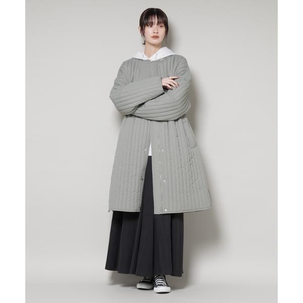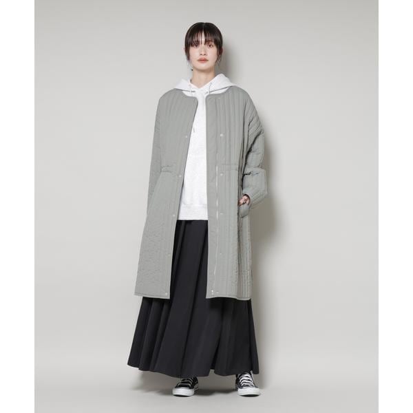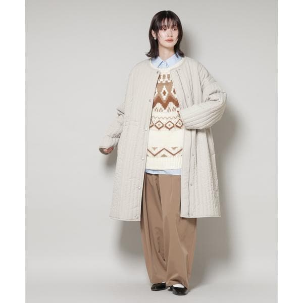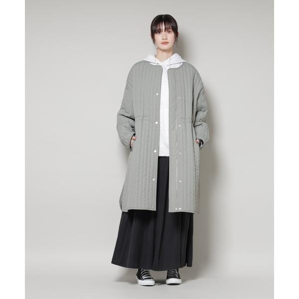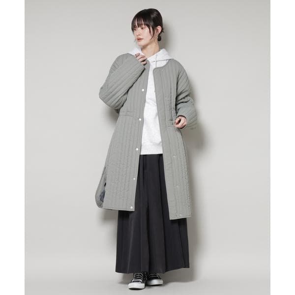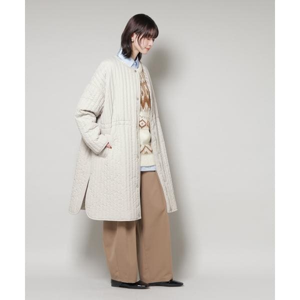 暖かな着心地の中綿ノーカラーコート。オーバーサイズながらも、縦ラインのステッチが全体をすっきり見せてくれるデザイン。マットな質感が上品さをプラスし、軽くて撥水機能も備えているため、デイリーからお出かけまで活躍する万能アウターです。