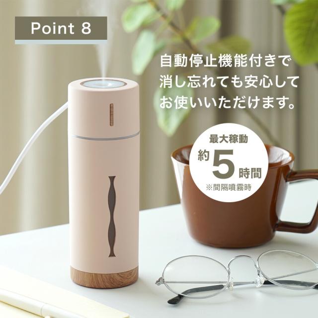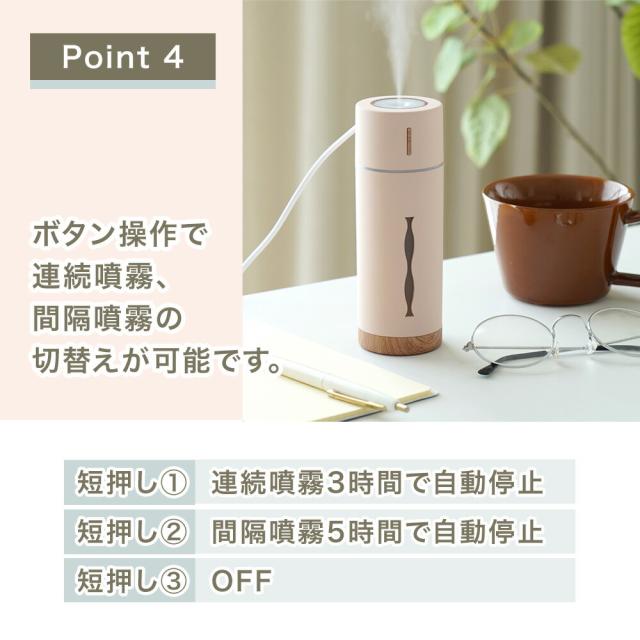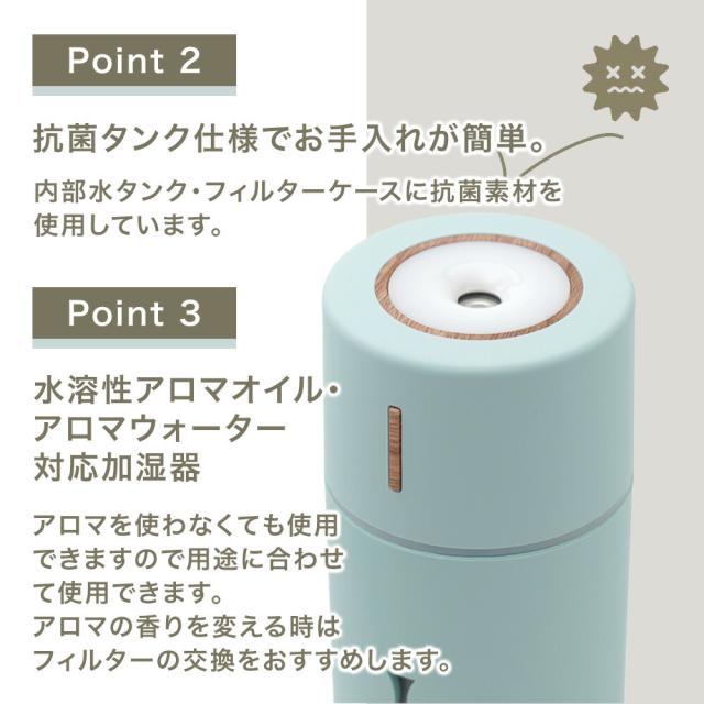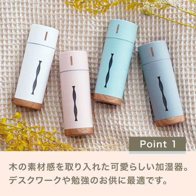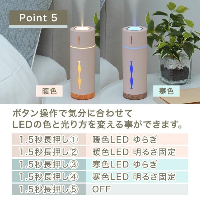 商品情報 | コンパクト加湿器 RUBIN ルビン 全4色 抗菌仕様 水溶性アロマオイル対応 アロマウォーター対応 USB給電 手のひらサイズで、机の上でも邪魔にならないコンパクトな加湿器 LEDの色と光り方が選べるので気分に合わせて光も楽しむ事ができます。 ■木の素材感を取り入れた可愛らしい加湿器。 デスクワークや勉強のお供に最適です。 ■抗菌タンク仕様でお手入れが簡単。 ■水溶性アロマオイル・アロマウォーター対応加湿器。 アロマを使わなくても使用できますので用途に合わせて使用できます。 アロマの香りを変える時はフィルターの交換をおすすめします。 ■ボタン操作で連続噴霧、間隔噴霧の切替えが可能です。 噴霧 ・短押し1:連続噴霧(3時間で自動停止) ・短押し2:間隔噴霧(5時間で自動停止) ・短押し3:OFF ■LEDの色と光り方を変える事ができます。 LEDの色は「暖色」「寒色」。 LEDの光り方は 呼吸するように明るさの強弱がゆっくり変化する「ゆらぎLED」か「明るさ固定」から選べます。 LEDランプ ・1.5秒長押し1:暖色LED(ゆらぎ) ・1.5秒長押し2:暖色LED(明るさ固定) ・1.5秒長押し3:寒色LED(ゆらぎ) ・1.5秒長押し4:寒色LED(明るさ固定) ・1.5秒長押し5:OFF ■USB接続でパソコンやUSBバッテリーから給電できます。 ■超音波式なので熱くならず安全です。 デスクの上や車内の運転時、自分用の加湿器としてご使用できます。 ■自動停止機能付きなので寝室などでの使用時に消し忘れても安心してお使いいただけます。 |