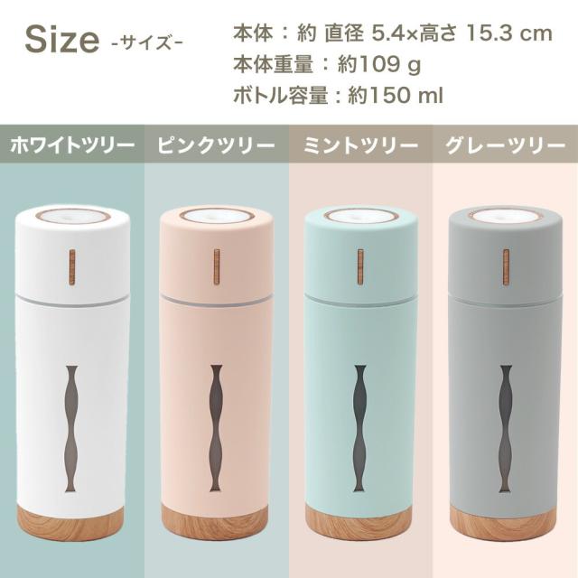 仕様 | 内容物:取扱説明書・保証書、本体1個、フィルターケース1本、フィルター3本、USBケーブル 1本(USB-A/USB-C) カラー:ホワイトツリー/ピンクツリー/ミントツリー/グレーツリー 電源:USB電源(USB-A/USB-C) 電圧/電流:DC5V/350mA 定格消費電力:2.5W ボトル容量:約150ml 噴霧量:最大約40ml/1時間あたり 使用時間:連続噴霧時:3時間(自動停止) 間隔噴霧時:5時間(自動停止) 加湿方式:超音波式 |