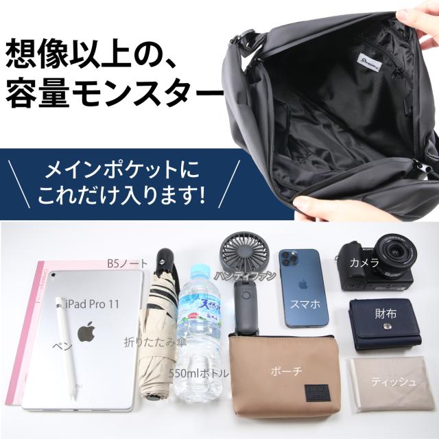 タブレット(iPad mini )収納も可能な大容量なのにシンプルでコンパクトなシルエット。