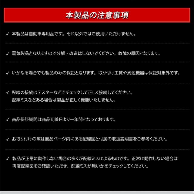 ■設置の際は水が中に入らないようにホーンの開口部分を下に向けて設置してください。 ■電気製品となりますので分解・改造はしないでください。故障の原因となります。 ■いかなる場合でも製品のみの保証となります。取り付け工賃や周辺機器は保証対象外です。 ■配線の接続はテスターなどでチェックして正しく接続してください。配線ミスなどある場合は製品が正しく機能いたしません。 ■商品保証期間は商品到着日より一年間となっております。 |