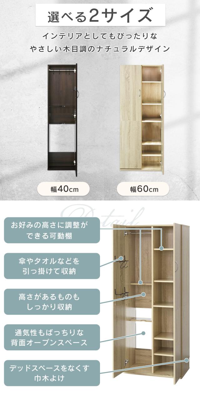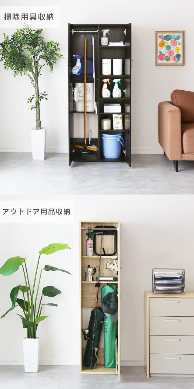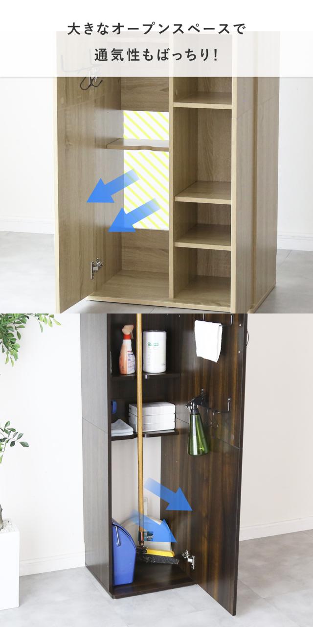 掃除用具収納に欠かせないのが“通気性”。本製品は背面をあえてオープン設計にすることで、湿気やカビの発生を防ぎます。雑巾なども気軽に収納でき、使った後の乾燥もスムーズ。常に空気が循環するため、清潔で衛生的な状態をキープできます。玄関やリビングなど、湿気が気になる場所でも安心して使える収納家具として、多くのご家庭で重宝されています。