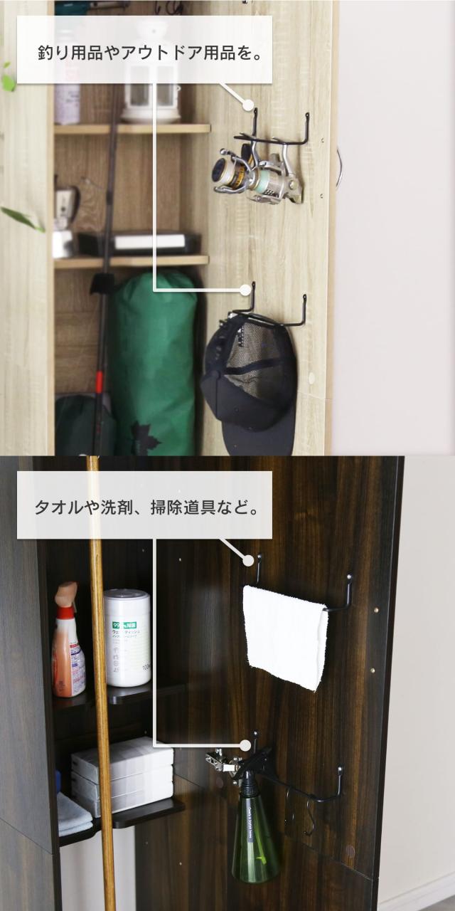 本体内部には可動棚を採用し、収納するアイテムの高さに合わせて自由に調整可能。長さのあるモップやスプレーボトルから、細かい掃除用品、釣り道具やアウトドア用品まで、ライフスタイルに合わせて効率的に整理できます。棚板はしっかりとした耐荷重を備え、重たい清掃用品や洗剤ボトルを収納しても安心。大容量ながらもスッキリ見せられる構造で、狭い空間でも使いやすい設計です。