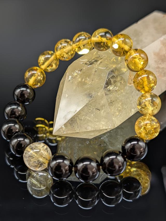 「不幸を寄せ付けない」モリオンが持ち主を悪事災難から強力に守護し、アンバーで健康を高め幸運を引き寄せ、ルチルクォーツで金銭運、財の運を呼び込み、持ち主を助け、保護し、サポートする組み合わせです。