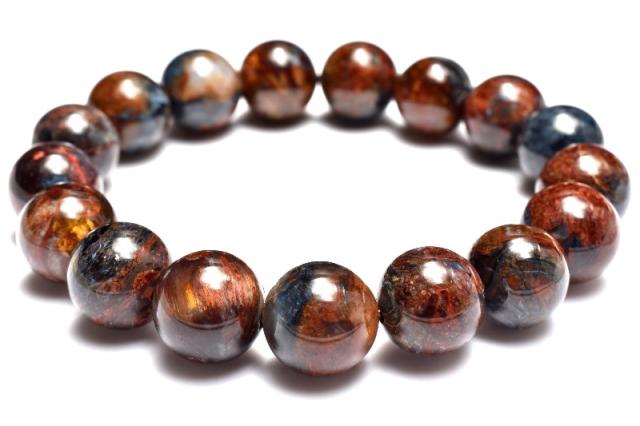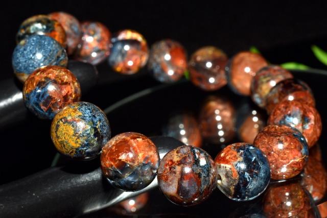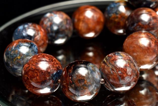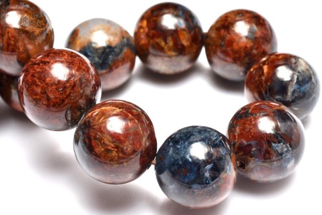 | 特徴・意味 | ツヤ感とマーブル模様が美しく、シャトヤンシー効果もバッチリ確認できます。 黄色味が多めでゴージャス感漂うタイプです。 1962年、南アフリカのナミビアで、シッド・ピータースによって発見された新しい石。 タイガーアイやブルータイガーアイが地殻変動で崩れた後、再度石英で固まったものです。 一般的にはタイガーアイ系の茶褐色が多いですが、ブルータイガーの青系もあり、茶と青の混じったものもあります。 独特の粉々になった模様が嵐のようだというので、テンペストストーン(嵐の石)とも呼ばれます。 タイガーアイは、石英(せきえい)の中に、青い石綿が入ったもので、めのうの仲間です。 これが地熱で温まり、黄色になったのが、タイガーアイです。 ブルータイガーアイの一筋の光が、一度崩れたことによって、あちこちを向いて輝いていて、神秘的な感じになっています。 渋くて不思議なものが好きな方には、たまらないかも。 どこかのブランド物の織物のようです。 地殻や自然の激しい動きにさらされた石は、困難を切り抜ける知恵を持っています。 ピーターサイトは、めちゃくちゃになった物事を、再度作り上げ、昇華していこうとする人に、援助を惜しまない石です。 ブルータイガーアイよりも、さらに強いエネルギーを求めたい人におすすめ。 |