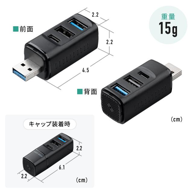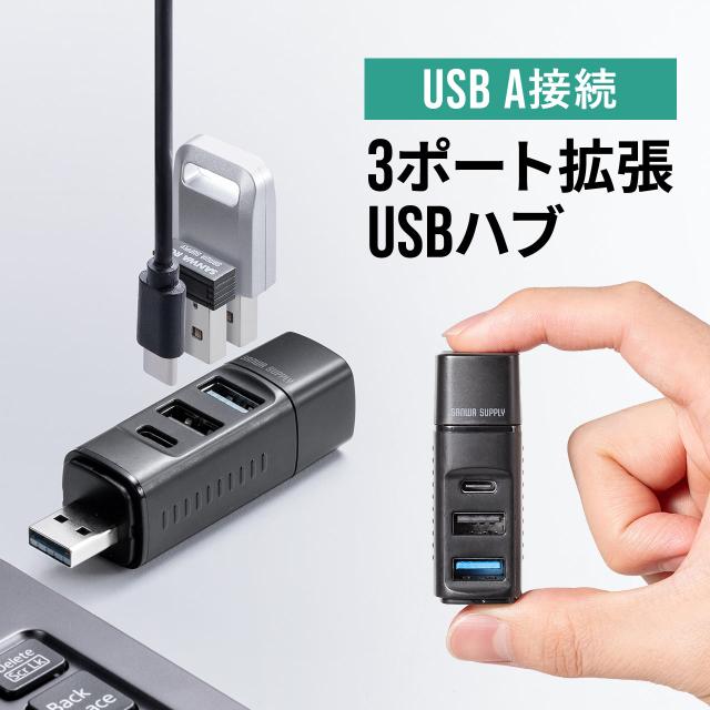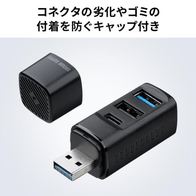 USBハブ コンパクト 小型 USB-A接続 USB3.0 USB2.0 バスパワー USB-Cポート USB Aポート 3ポート コンボハブ 黒色 軽量[400-HUBA39BK]