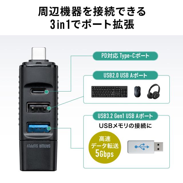 ●超小型ながらUSB 5G×1ポート、USB2.0 A×1ポート、USB2.0 Type-Cポート×1ポートのコンボハブです。●ワイヤレスマウスのレシーバーなどUSB 5Gが必要ない機器と併用するのに最適です。