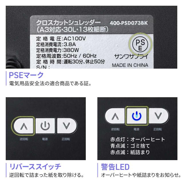 ⇒ご購入の前にご確認下さいA3用紙を最大13枚まで一度に処理し、4×40mmのクロスカットで情報漏洩対策も可能な大容量30Lシュレッダー。静音58dB設計と逆回転・LED警告などの安全機能を備え、CD/DVDやカードなどのマルチメディアの細断にも対応。大判資料の処理をストレスなく行える信頼のオフィス必携モデル。【WEB限定商品】