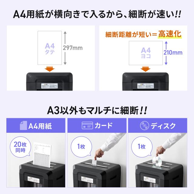 クロスカットシュレッダー 大容量30L A3対応 最大13枚同時細断 4×40mm CD/DVD対応 カード対応 情報漏洩対策[400-PSD073BK]