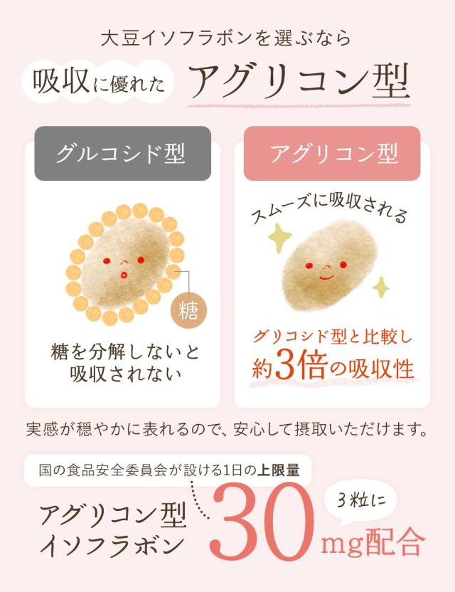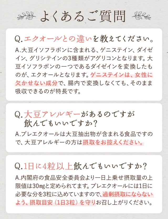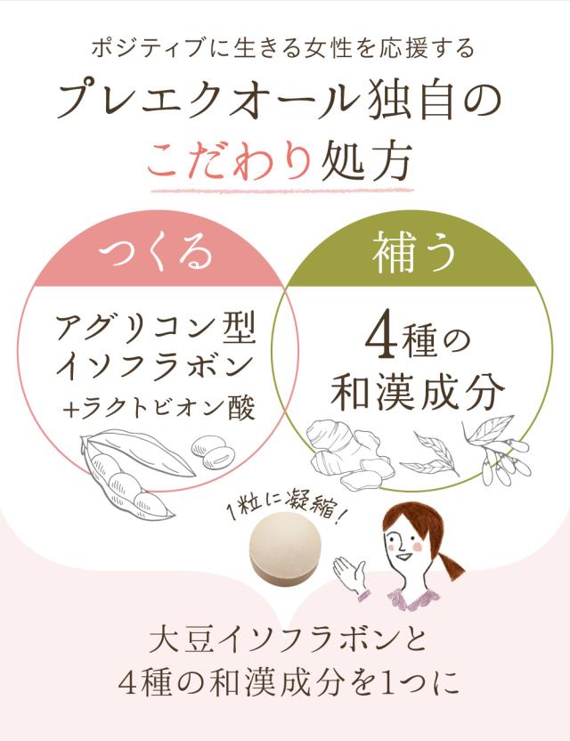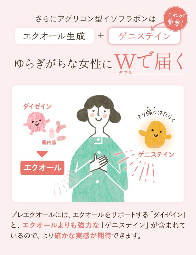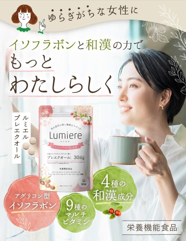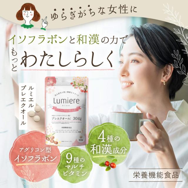 イソフラボンサプリメント「ルミエル プレエクオール」は、吸収性の高いアグリコン型イソフラボンを配合しているので、 ラクトビオン酸の力でエクオールを産生します。 さらにプレエクオールには、エクオールよりも強力に働くゲニステインが含まれているので、ゆらぎがちな女性の心身の健康をサポートします。 他にもサポート成分としてナツメ、クコの実、生姜、テアニンの4種の和漢成分を配合。 さらに、不足しがちなビタミン(ビタミンA、ビタミンC、ビタミンE、ビタミンD、ビタミンB1、ビタミンB2、ビタミンB6、ビタミンB12、葉酸)を配合した栄養機能食品ですので、マルチビタミンサプリとしてもご活用いただけます。 加齢とともに女性らしさを保つチカラが減少していく中高年女性の心と体を軽くし、前向きで健やかな毎日を過ごせるように、「ルミエル プレエクオール」で積極的に補給することをおすすめします。