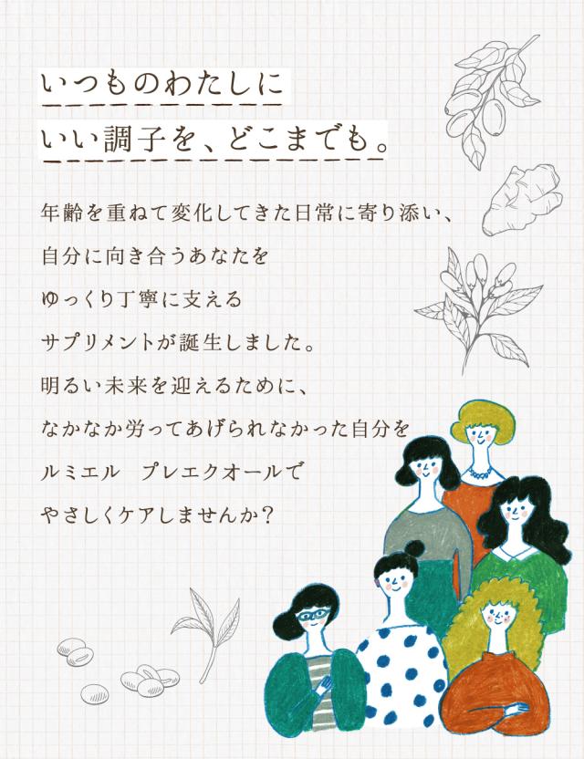 年齢を重ねて変化してきた日常に寄り添い、自分に向き合うあなたをゆっくり丁寧に支えるサプリメントが誕生しました。 明るい未来を迎えるために、なかなか労ってあげられなかった心やカラダの不調をルミエルプレエクオールでやさしくケアしませんか?