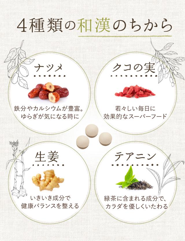 還元麦芽糖(国内製造)、大豆抽出物、乳糖発酵物(乳成分を含む)、クコの実末、ショウガ末、ナツメ抽出物/セルロース、V.C、卵殻Ca、ステアリン酸Ca、二酸化ケイ素、V.E、L-テアニン、パントテン酸Ca、V.B1、V.B6、V.B2、V.A、葉酸、V.D、V.B12