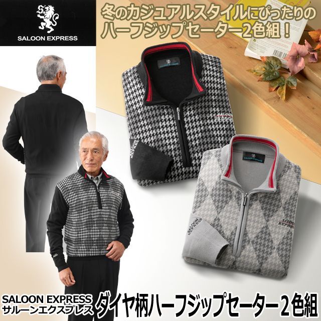 SALOON EXPRESS(サルーンエクスプレス)ダイヤ柄ハーフジップセーター2色組 メンズ 紳士 秋冬 ファスナー 長袖 あったか 秋冬 アクリル お洒落 贈り物