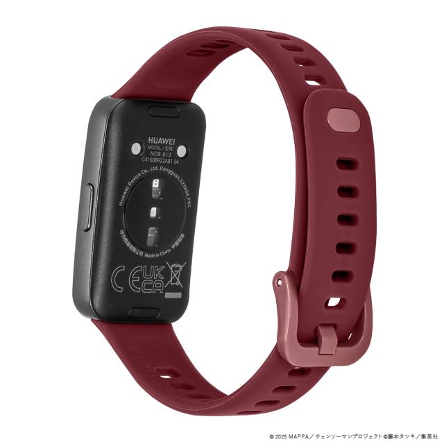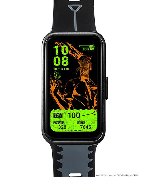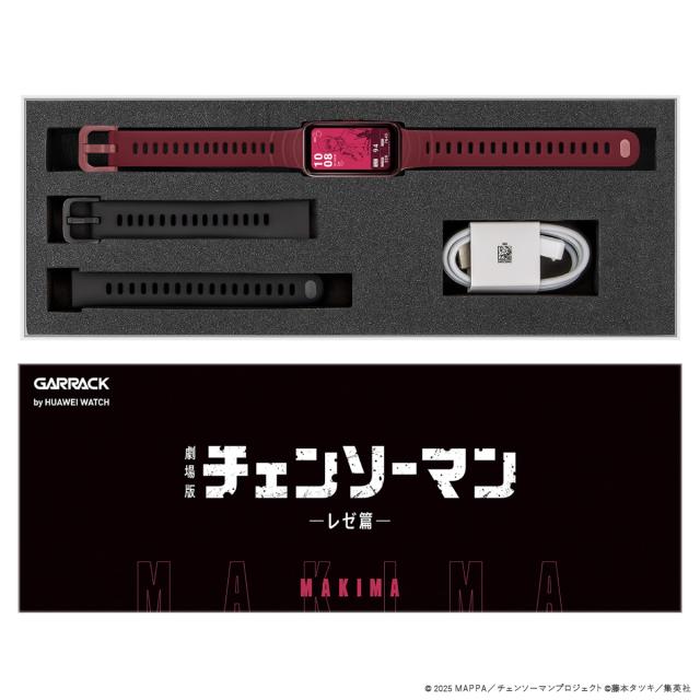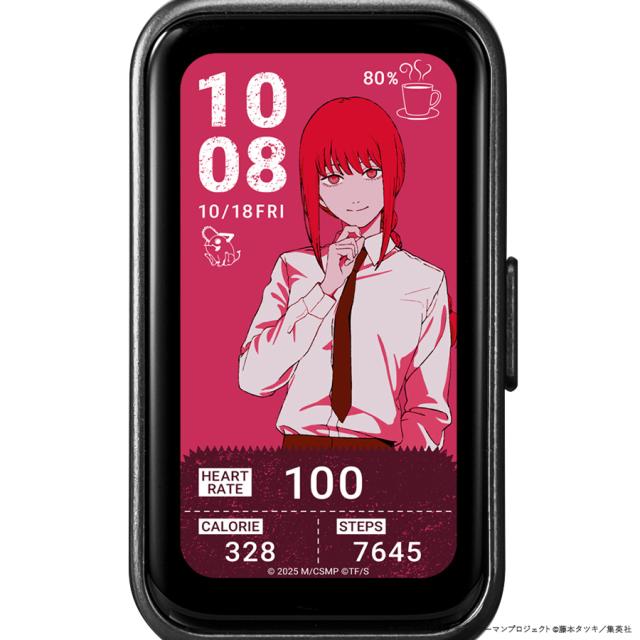 通知があるとポチタが出現し、歩数や消費カロリー、心拍数は赤を基調としたマキマモデル限定デザインで表示。深いレッドカラーのキャラクターモチーフバンドが腕元を引き締め、ユニセックスに使いやすい落ち着いたトーンで仕上げています。さらに、普段使いに合わせやすいブラックの替えベルトが付属しており、その日の気分に応じて雰囲気を切り替え可能。特製の劇場版デザインボックス入りで、コレクションとしても魅力的なアイテムです。