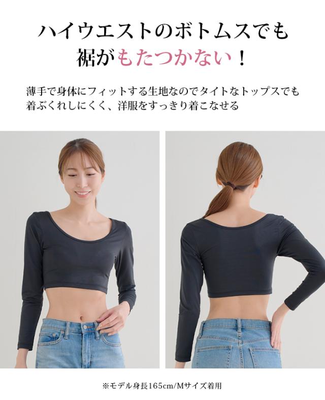 ショート丈インナーが登場!みぞおちくらいのショート丈なのでトレンドのクロップド丈トップスのインナーにぴったり。薄手で身体にフィットする生地なので、タイトなトップスでも着ぶくれしにくく、洋服をすっきり着こなせます。腕を上げた時の、チラ見え防止にも活躍。ぴたっとしたフィット感もうれしい1枚です。