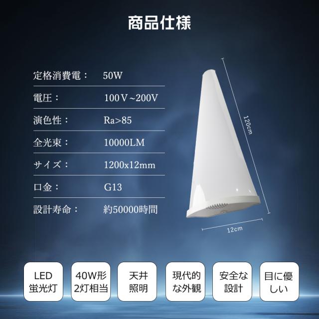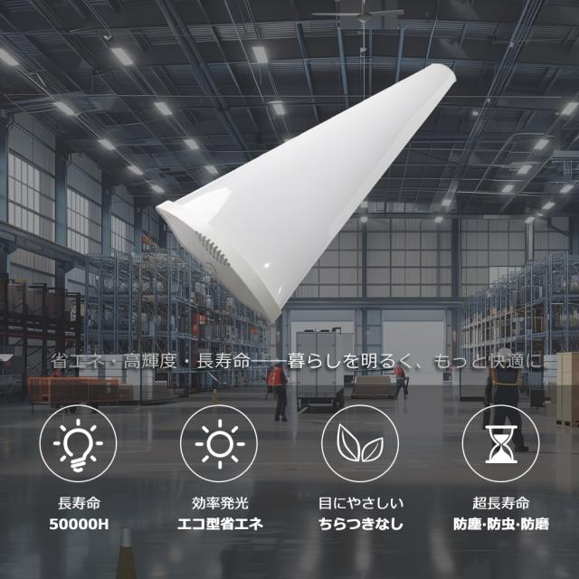 - 驚異の高輝度10,000ルーメンで、40W型蛍光灯2本分に相当する明るさを1本で実現!工場・倉庫・厨房など広い空間でもしっかり照らします。