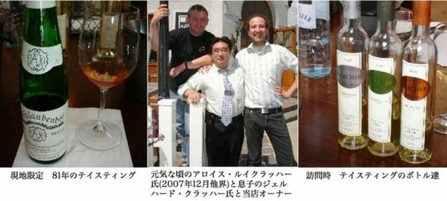 2007年に働き盛りで急逝した先代のアロイス・クラッハー氏は冷静に、「自分は非常に恵まれているだけ。父親の努力が土台となり、また高級甘口ワインに対する感心が世界的にみて今までになく高かったから。」と語っておりました。 父・アロイスの後を継いだゲオハルト・クラッハー氏は、「世界的に有名なワイナリー」というプレッシャーのなか、叔父・ルイス(畑の管理)と母・ミハエラ(事務担当)とともに、最高級のワインを造るため努力をしています。2008年に来日し、大使館での試飲会を開催するなど、奮闘中です 。