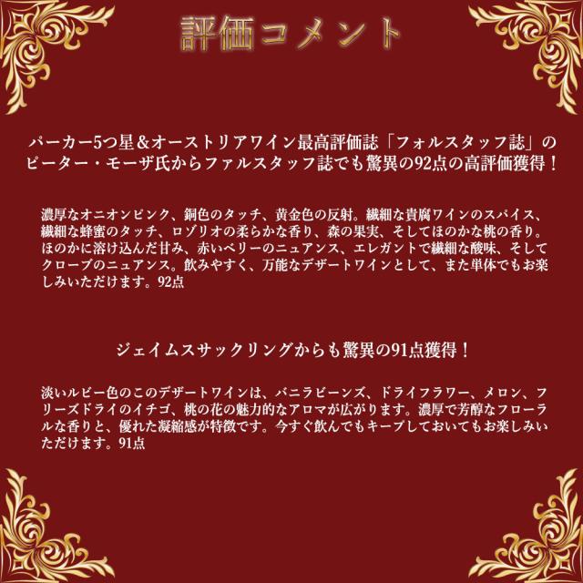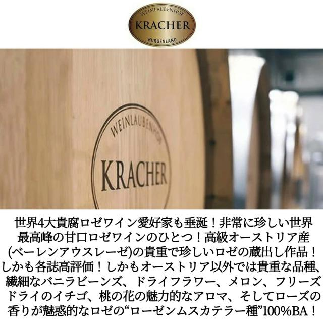 世界4大貴腐ロゼワイン愛好家も垂涎!非常に珍しい世界最高峰の甘口ロゼワインのひとつ!高級オーストリア産 (ベーレンアウスレーゼ) の貴重で珍しいロゼの蔵出し作品!しかも各誌高評価!しかもオーストリア以外では貴重な品種、繊細なバニラビーンズ、ドライフラワー、メロン、フリーズドライのイチゴ、桃の花の魅力的なアロマ、そしてローズの香りが魅惑的なロゼのローゼンムスカテラー種”100%BA!