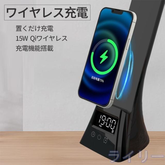 即日発送 デスクライト LED 学習机 目覚まし時計 ワイヤレススマホ充電 USB出力 三段階調色 無段階調光 電気スタンド 卓上ライト 目に優しい 高輝度