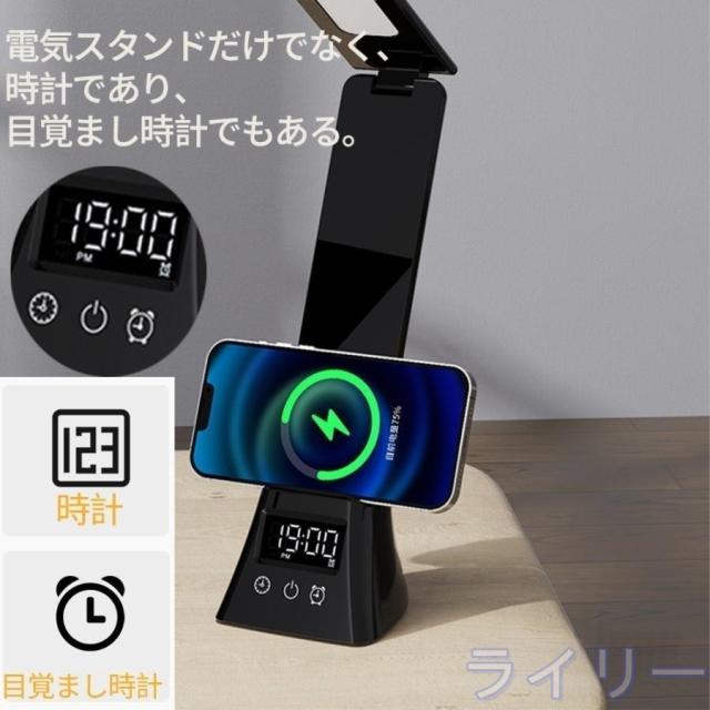 機能:デスクライト、ワイヤレススマホ充電、時計、目覚まし時計、携帯電話スタンド
