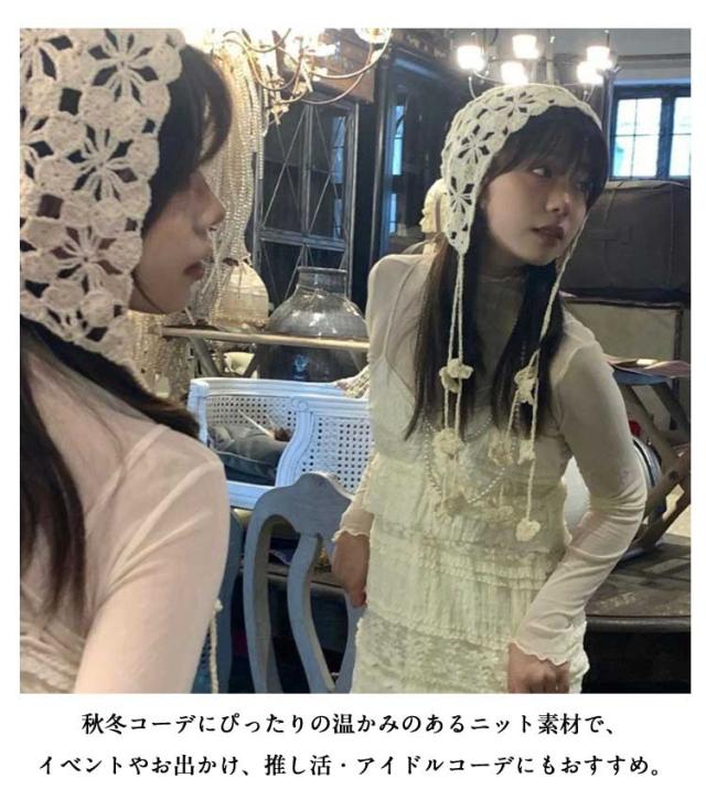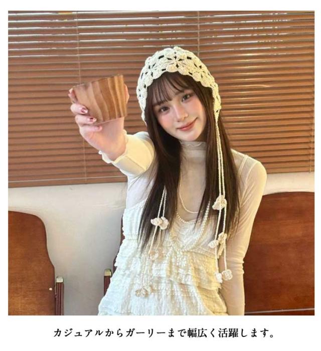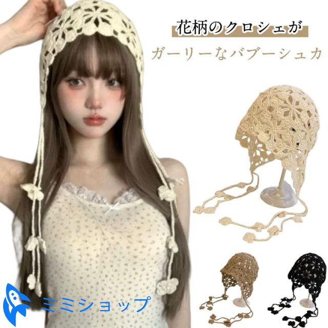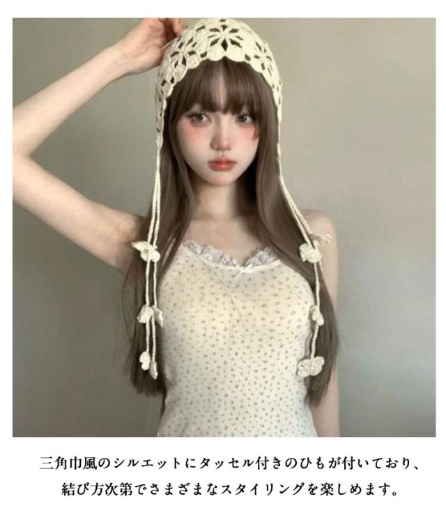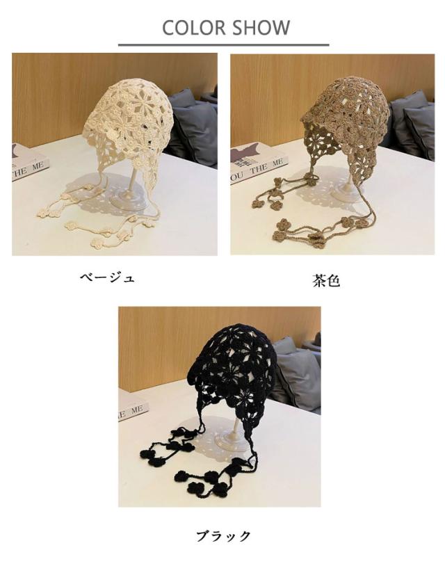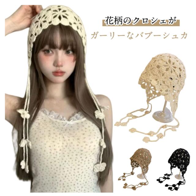 アイドル カジュアル ビーニー バブーシュカ レディース クロシェ おしゃれ かぎ針編み 黒 トレンド ひも 秋 冬 花 ニット 帽子 ハット イベント バブーシュカ ベージュ 茶色 ブラック 韓国 三角巾 大人 ヘッドバンド スカーフ