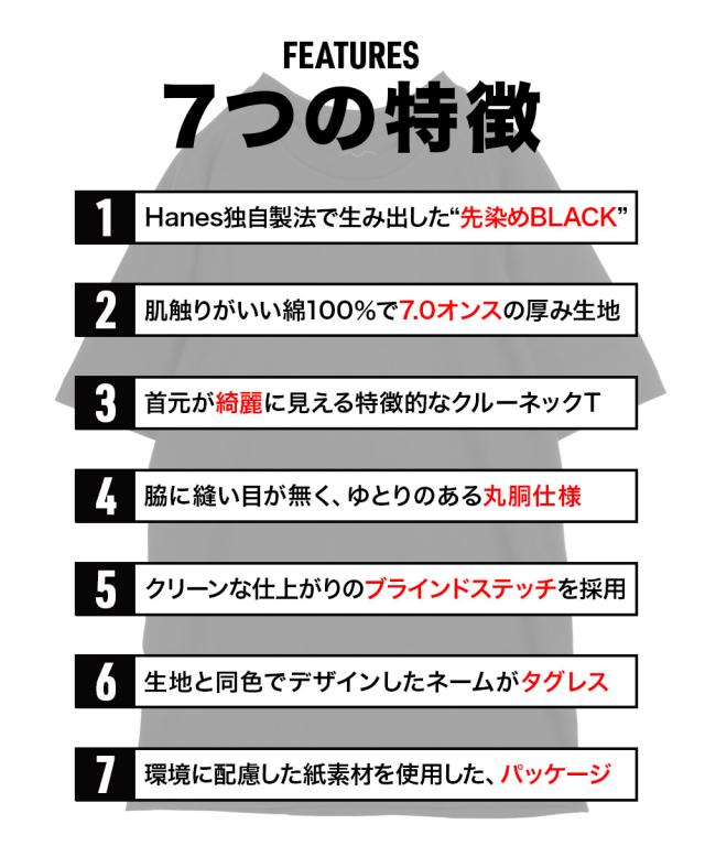 脇に縫い目のない丸胴編みによるストレスフリーな着心地。身幅と袖幅にゆとりを持たせたアメリカンスタイルのシルエット。”これでいい”じゃなく”これがいい”と言わせたい、Hanesのこだわりが詰まった黒Tシャツをぜひ!