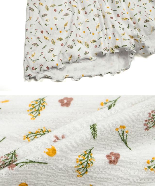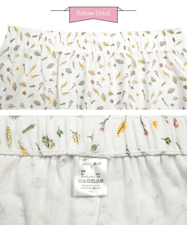 レースのように小さな穴のあいた薄手のアイレット生地で夏にぴったりな素材感。トップスの袖・裾とショートパンツの裾のメロウフリルが女性らしいデザイン。