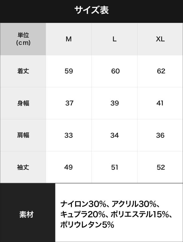 ナイロン30%、アクリル30%、キュプラ20%、ポリエステル15%、ポリウレタン5%
