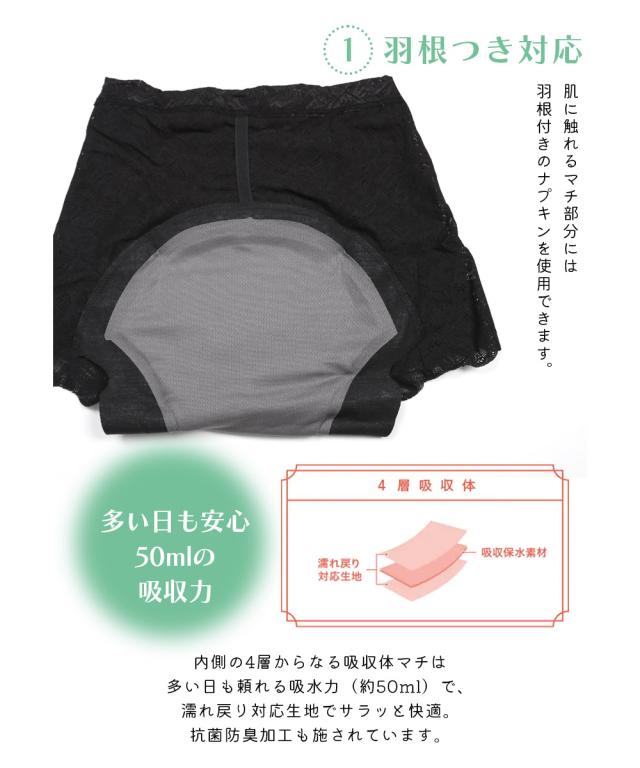 締め付けや圧迫感の少なさ、チクチク感を軽減した肌あたりのやさしいレースはそのまま、吸水マチ部分を従来品からアップデート。マチ部分が薄くなり、吸水量(約50ml)は変わらずゴワゴワ感を軽減。