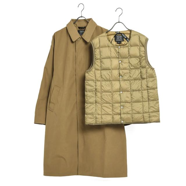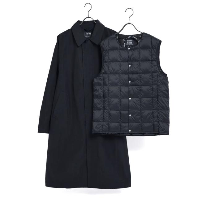 | 商品詳細 | 1着で2通りの着こなしが楽しめる、 バルカラーコート(アウター)と、TAIONの定番クルーネックダウンベスト(ライナー:TAION-004)を組み合わせた、着脱可能なセットアウター。