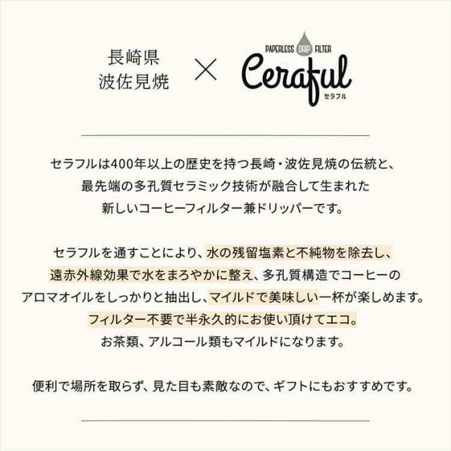 セラフルは400年以上の歴史を持つ長崎・波佐見焼の伝統と、最先端の多孔質セラミック技術が融合して生まれた新しいコーヒーフィルター兼ドリッパーです。