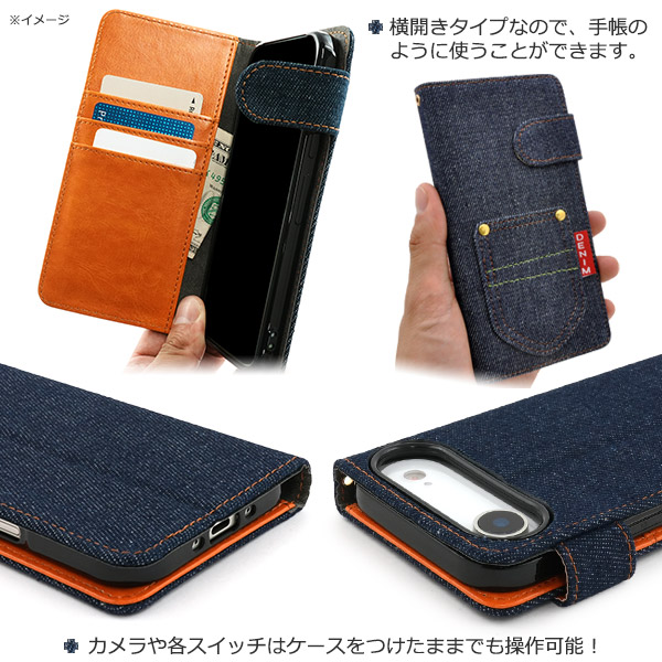 衝撃やキズなどからスマホを守ります。 内部ケースはソフトケースのため、着脱が簡単です。 男女どちらでもお使いいただける、スタイリッシュなデニムデザイン。 内側は落ち着いたレザーデザインです。 背面を折り返すとスタンドとして使用でき、動画視聴に便利です。 落下防止に便利なストラップホール付きです。 横開きタイプなので、手帳のように使うことができます。 また、内側に3つのカードポケットとサイドポケット付きです。 |