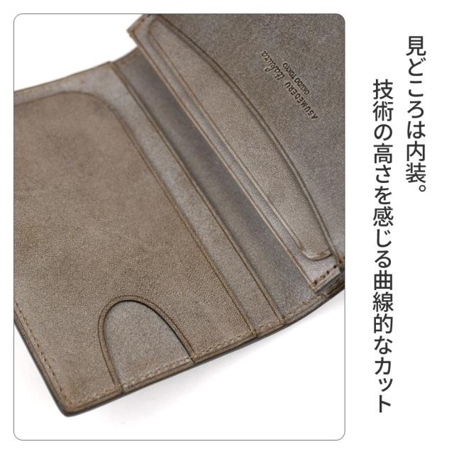 ワックス加工が印象的なロロマレザーの高品質シリーズ。外見のシンプルさとは裏腹に、内装では随所にカッティングの機能美が見られます。フタ裏のカード収納下部にある半円形のカットは、パスケースのようにカードに指を添えられるようにするため。上部の角丸は、当たりをやさしくししつつ、中身を取りやすくするため。手前のカード収納にある仕切りでは、端を縫製しなくてもいい横幅に収めることでスリム化を実現。これらの工夫こそが、使い勝手の視点でデザインを考える、アスメデル独自のものづくりの哲学が感じられるポイント。もちろん、丁寧なネン引き・コバ塗りも顕在です。