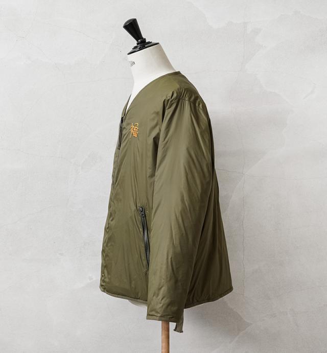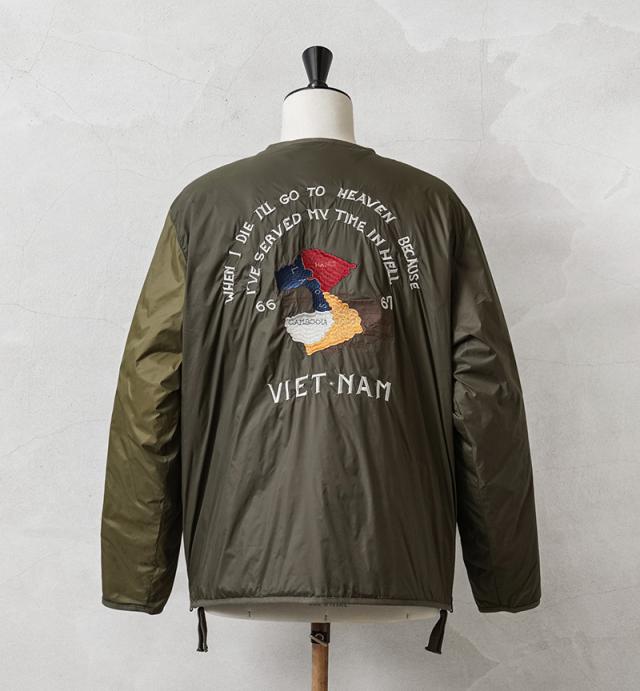 TAIONから、ヴィンテージ感や刺繍を活かした、ベトジャン風リバーシブルダウンジャケットが登場。JAPAN SPECIAL(JPNSP)は、様々なデザイナーと創り上げる、 TAIONの中でもデザイン性が高く、独自性のあるアイテムを展開するラインです。軽くて弾力のある800フィルパワーのダウンを使用。一般で使用されるダウンよりも軽くて、 暖かい空気をたくさん含むことができます。フロントはダブルジッパー開閉、少しゆとりをもたせたシルエットで、すっきりしたVネックは、シャツやパーカーとの重ね着やマフラーとの相性も抜群。リラックス感と動きやすさを兼ね備え、アウターとしてもインナーダウンとしてももたつかず重宝します。表側は印象的なベトジャン刺繍を拝したデザイン、裏側はヘチマキルトを配したダウンジャケット、気分やコーデに合わせて楽しめるリバーシブル仕様。
