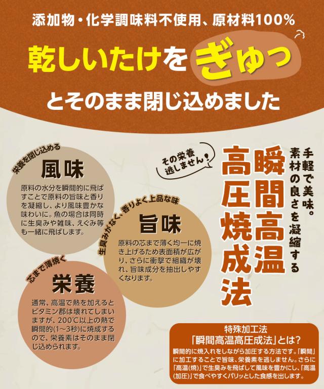 200℃にて高温高圧加工することで、菌数調整を行い乾椎茸をそのまま食べることが出来ます。