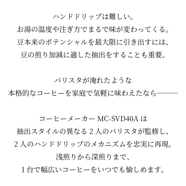 - 珈琲が好きで家で手軽にいれられる珈琲メーカーを探していたところ、こちらの珈琲メーカーが新発売されることを知りました。 プロのバリスタさんが2人も監修していて、浅煎りと深煎りの両方が楽しめる珈琲メーカーはなかなかなく、お値段が高めですが、思いきって買ってみました。 注文してから梱包まで早く、とても丁寧でさすがすべて日本での製造、出荷だと思いました。 自宅に届いてからさっそく試飲してみました。珈琲の口当たりのまろやかさや雑味のなさにびっくりして、お店で飲んでいる珈琲!!と感動しました! 今では毎日いれて自宅での珈琲を楽しんでます。思いきって買って良かったと本当に思います。