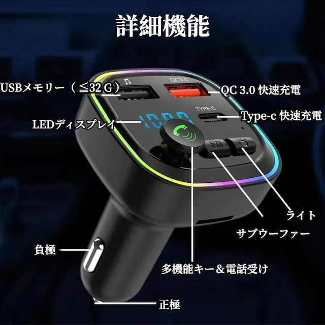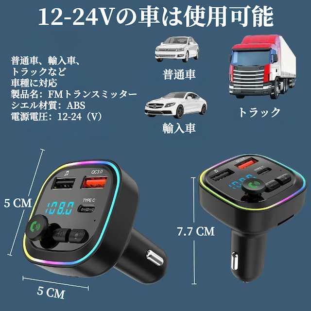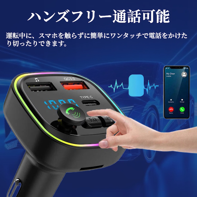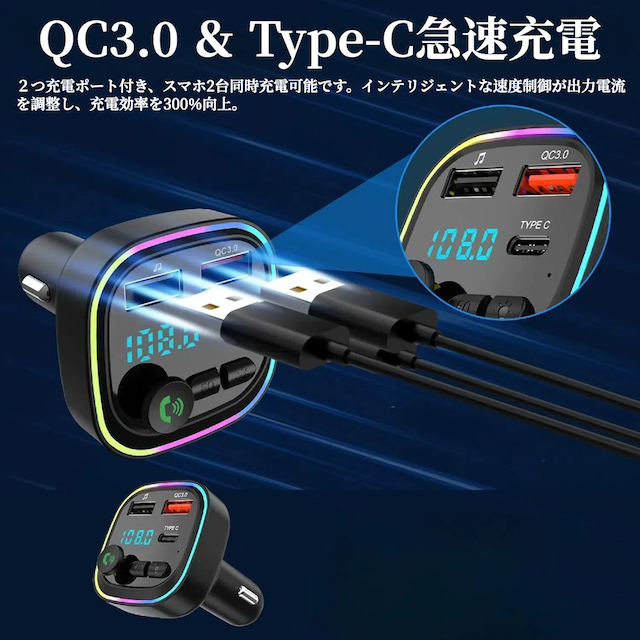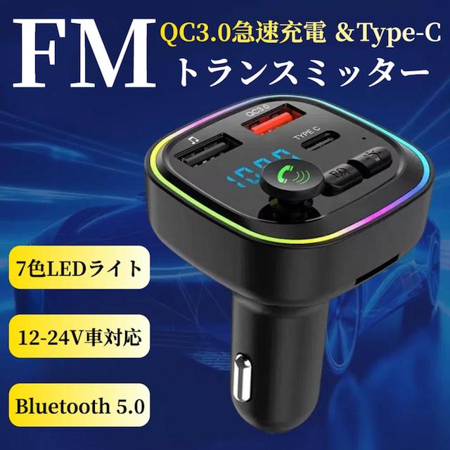 FMトランスミッター Bluetooth 5.0 【ハレゾラTBP公式店】 車用充電器 QC3.0急速充電 Type-C&2USBポート 車載FMトランスミッター USBメモリ TFカード CVCノイズ軽減 ハンズフリー通話 7色LEDライト シガーソケット 12-24V車対応 カーチャージャー ●