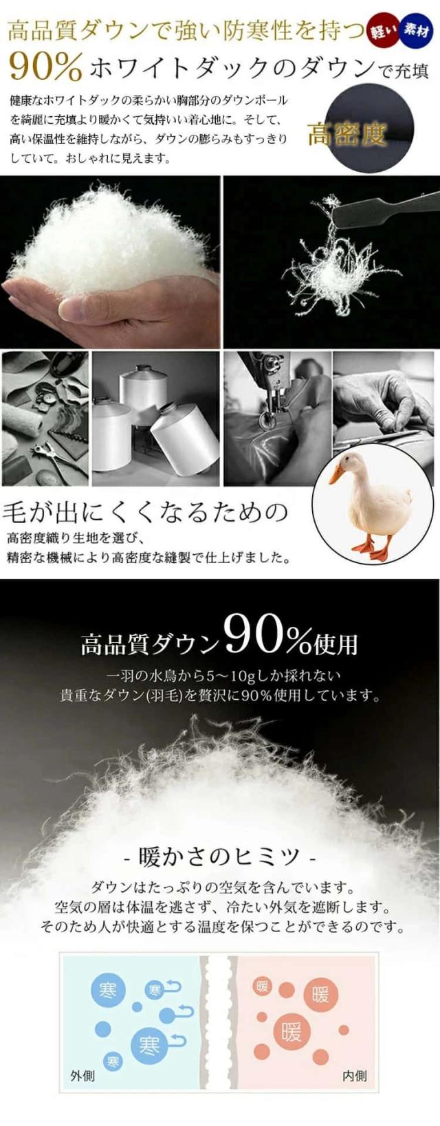 | 素材 | 表地:ポリエステル100% 裏地:ポリエステル100% 填充物:ダウン90%フェザー10% |