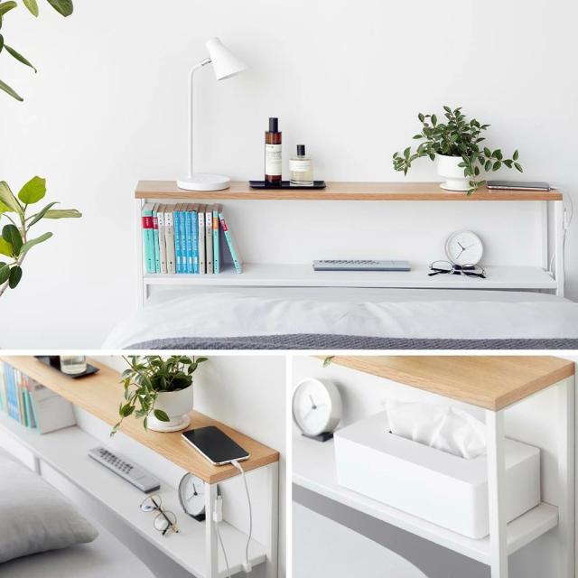 ベッド周りに収納棚を増設! ヘッドレスベッドはとてもコンパクトで部屋を広く使えますが、就寝時に収納場所がないのが悩みの種。そんな時にはこちらの商品を置くだけで、ベッド周りに簡単に収納棚を増設できます。 シングルベッドに丁度良い幅100cmの後付けヘッドボードで、ベッドの高さに合わせて、棚板の高さを3段階変更できます。 棚板は、表と裏を返すことで「フチあり」と「フチなし」を選べます。 マグネットが内蔵されたケーブルホルダーが2個付属しているので、スマートフォンなどの充電ケーブルをヘッドボードのお好みの位置に貼り付けて収納しておくことができます。 天然木の天板が目をひくスタイリッシュな外観なので、リビングなどでの使用もオススメです。 奥行15cmのスリムな設計で場所を取らず、インテリア小物や観葉植物を置く飾り棚にするのも素敵です。 ![]() ![]() ![]() ![]() ![]() ![]() ![]() ![]() ![]() ![]() ![]() ![]() ![]() ![]() |