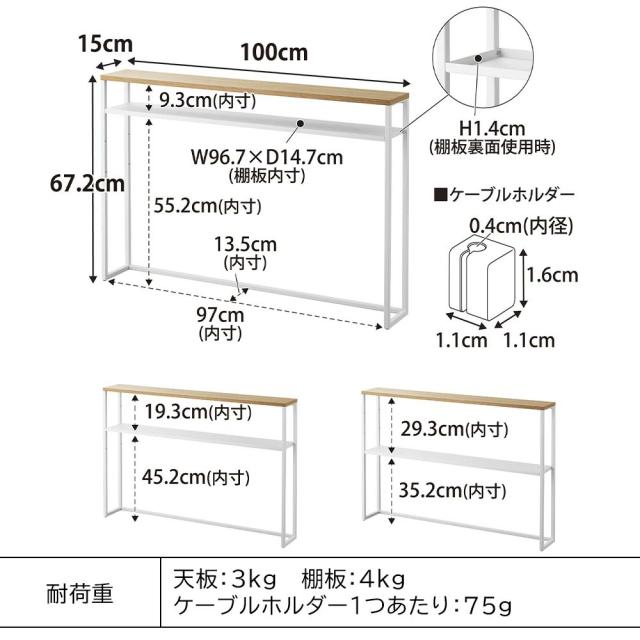 内寸サイズ ケーブルホルダー内径:4mm 棚板:W96.7×D14.7cm 棚板より上部:H9.3・19.3・29.3cm 棚板より下部:H55.2・45.2・35.2cm |