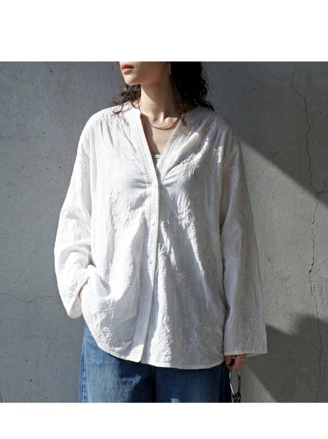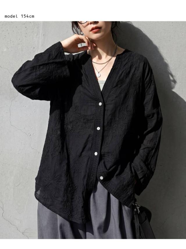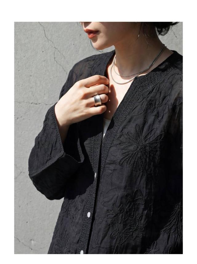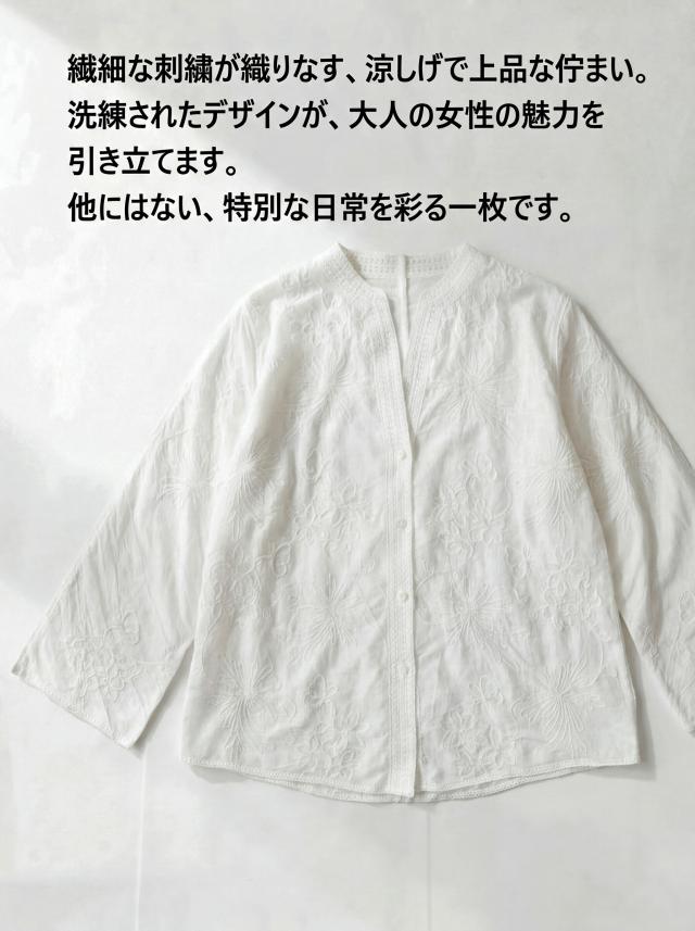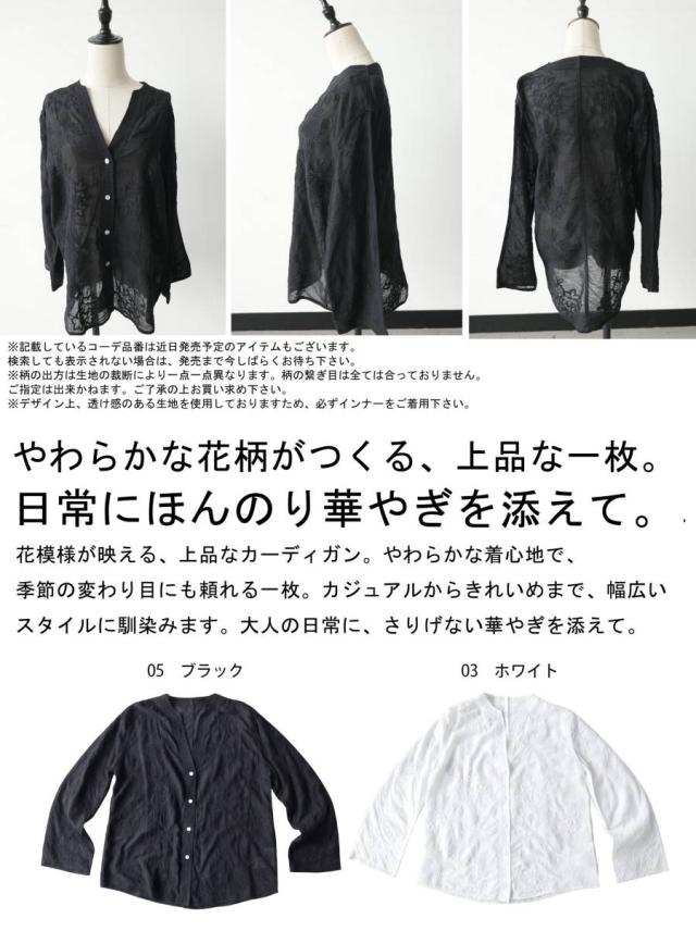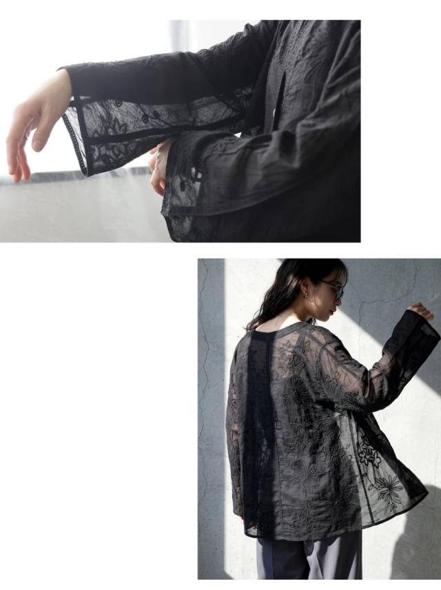 繊細な花柄刺繍がやわらかな存在感を放つシアーシャツカーディガンは、日常にさりげない華やかさを添える一着です。