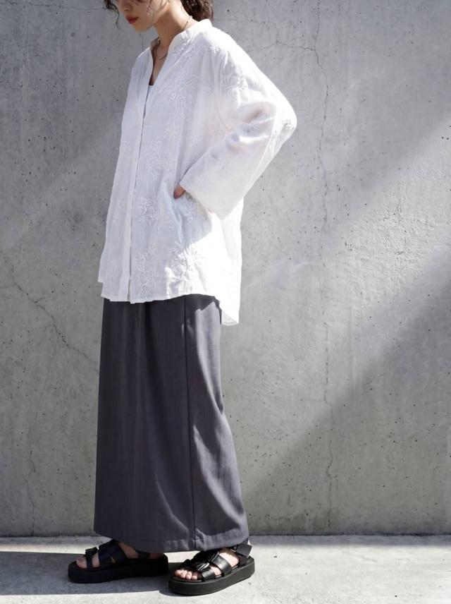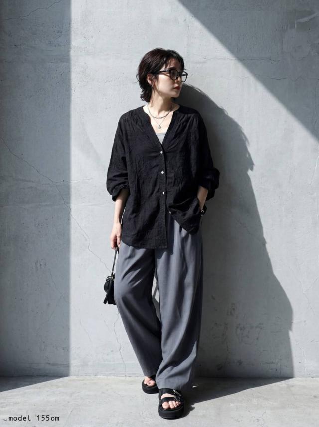前を閉じてブラウスとしても、開けて軽やかな羽織りとしても使え、着回し力の高い一枚です。