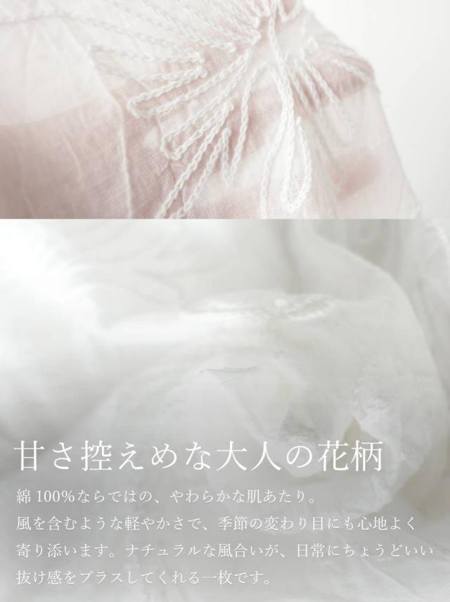 柄は甘さを抑えた立体感のある花柄刺繍で、形状はゆったりとしたシルエットだから体型カバーも叶います。