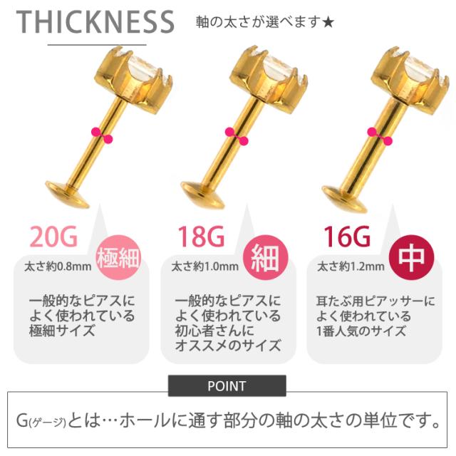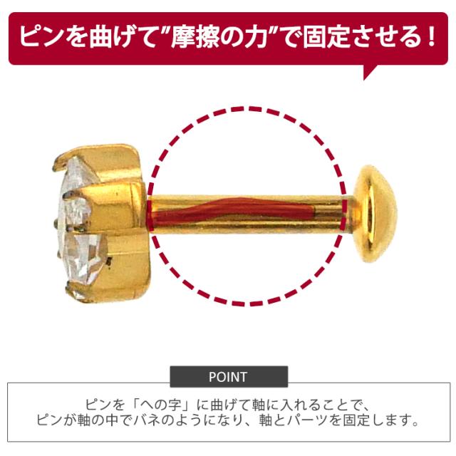 ボディピアスの定番アイテム、ラブレットスタッドがワンプッシュタイプの斬新設計に! ありそうでなかった、ネジ不使用のボディピアスが登場! トラガスのような狭い部位や、ネジタイプが苦手な方には特にお勧めです。 2サイズのジュエルサイズから、お好みの組み合わせでお選びいただけます!簡単に取り付けられることがプッシュピン最大の魅力です♪ヘッド部分から伸びるピンを曲げて、お好みの硬さに調節可能。差し込めば装着完了です!ネジが無いので、知らない間に緩んできて失くしてしまった、そんな悩みからも開放されます!