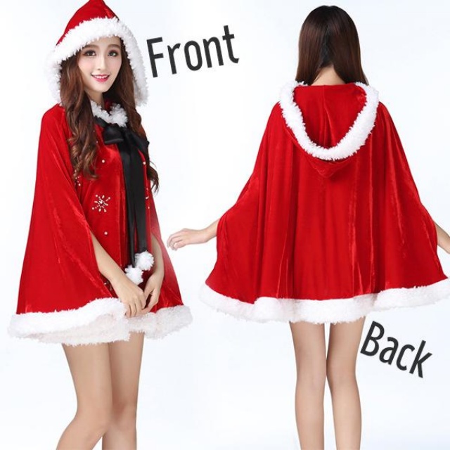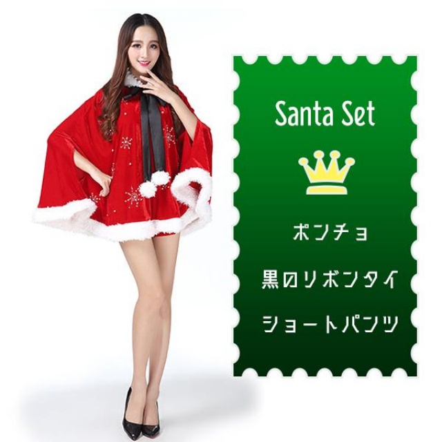 サンタガール ポンチョ&パンツ リボンタイ 3点セット サンタクロース コスプレ フード マント ケープ フリーサイズ クリスマス 送料無料