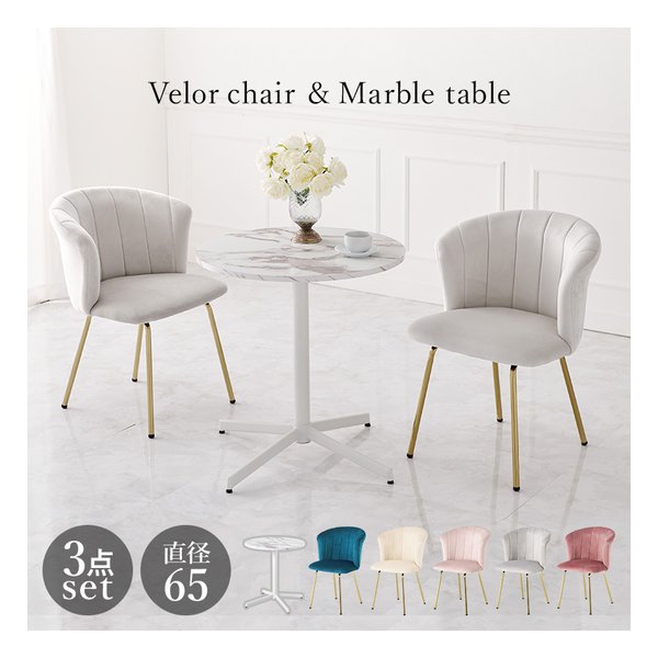 ベロア調生地のチェアと、リアルな大理石調天板のカフェテーブルを合わせた上品で大人かわいい3点セット。