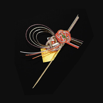 梅の花と飾り水引が付いた、見栄えのするお祝いピックです。